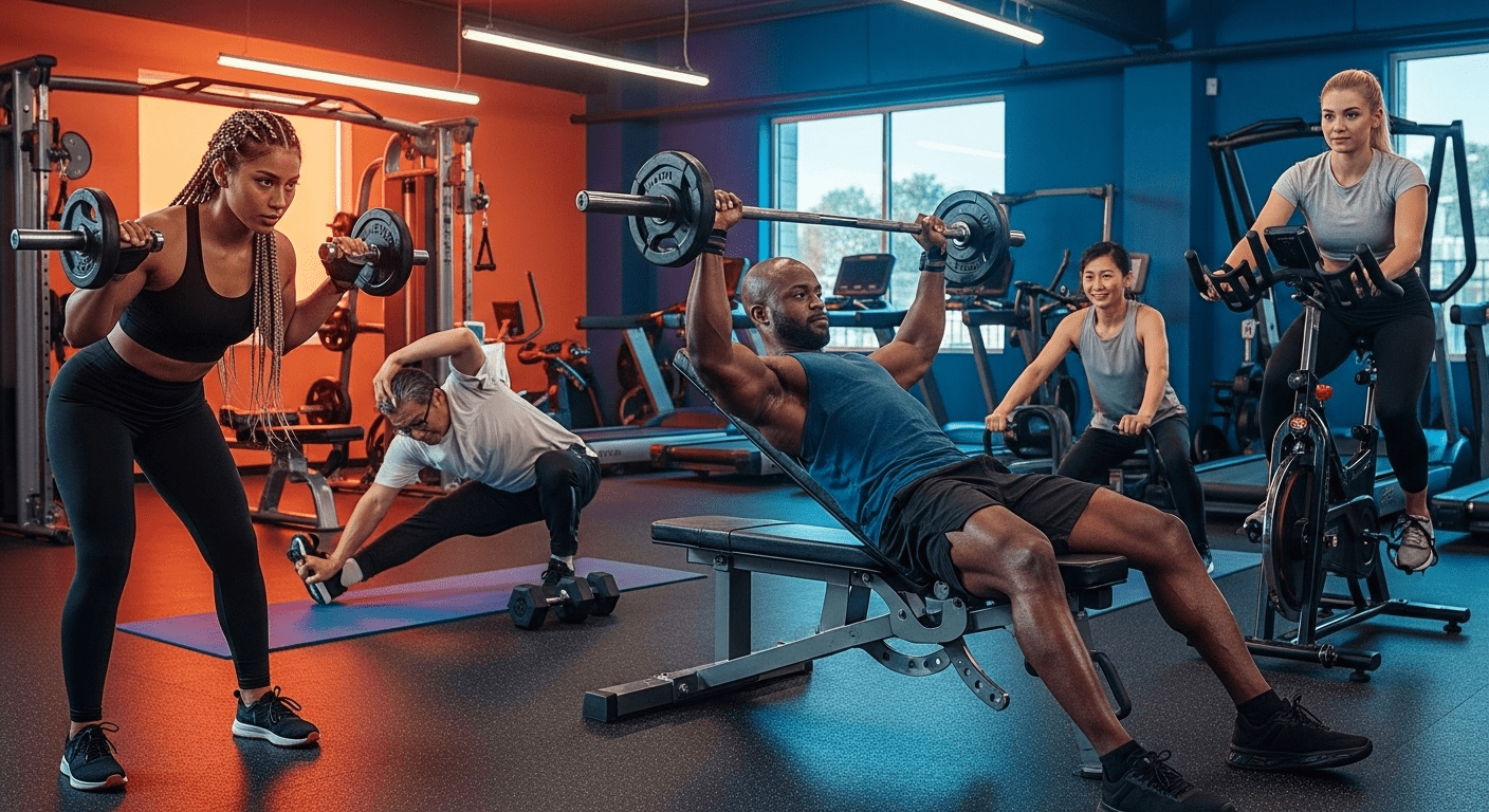 A dynamic gym scene showcasing diverse individuals engaged in various physical exercises, with a background highlighting the vitality and health benefits of an active lifestyle. no texts on scene. Keywords: photorealistic style, high resolution, 4k details, HDR, cinematic lighting, professional photography, studio lighting, vibrant colors.