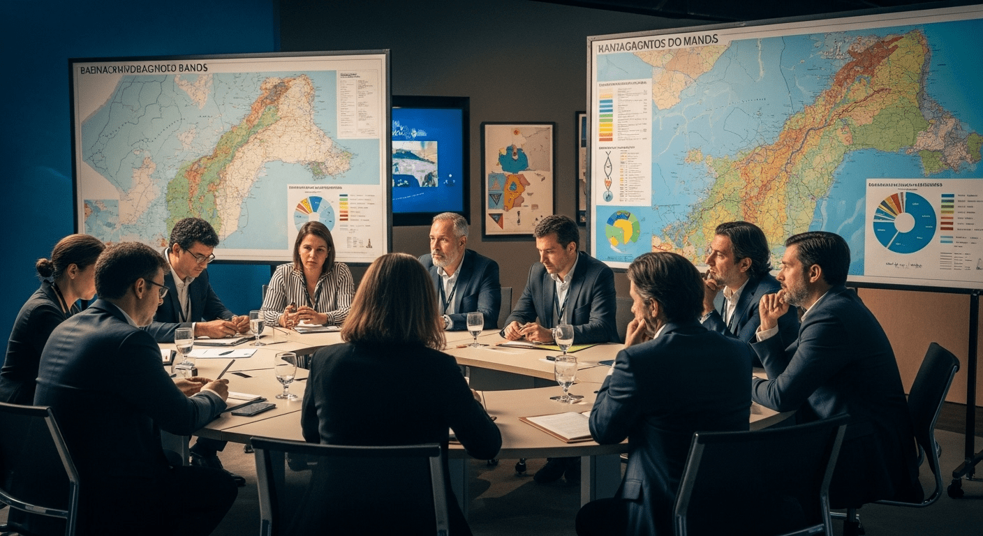 A vibrant conference room filled with engaged participants discussing water management, with a backdrop featuring maps and charts of hydrographic basins, in a modern Salvador setting. no texts on scene. Keywords: photorealistic style, high resolution, 4k details, HDR, cinematic lighting, professional photography, studio lighting, vibrant colors.