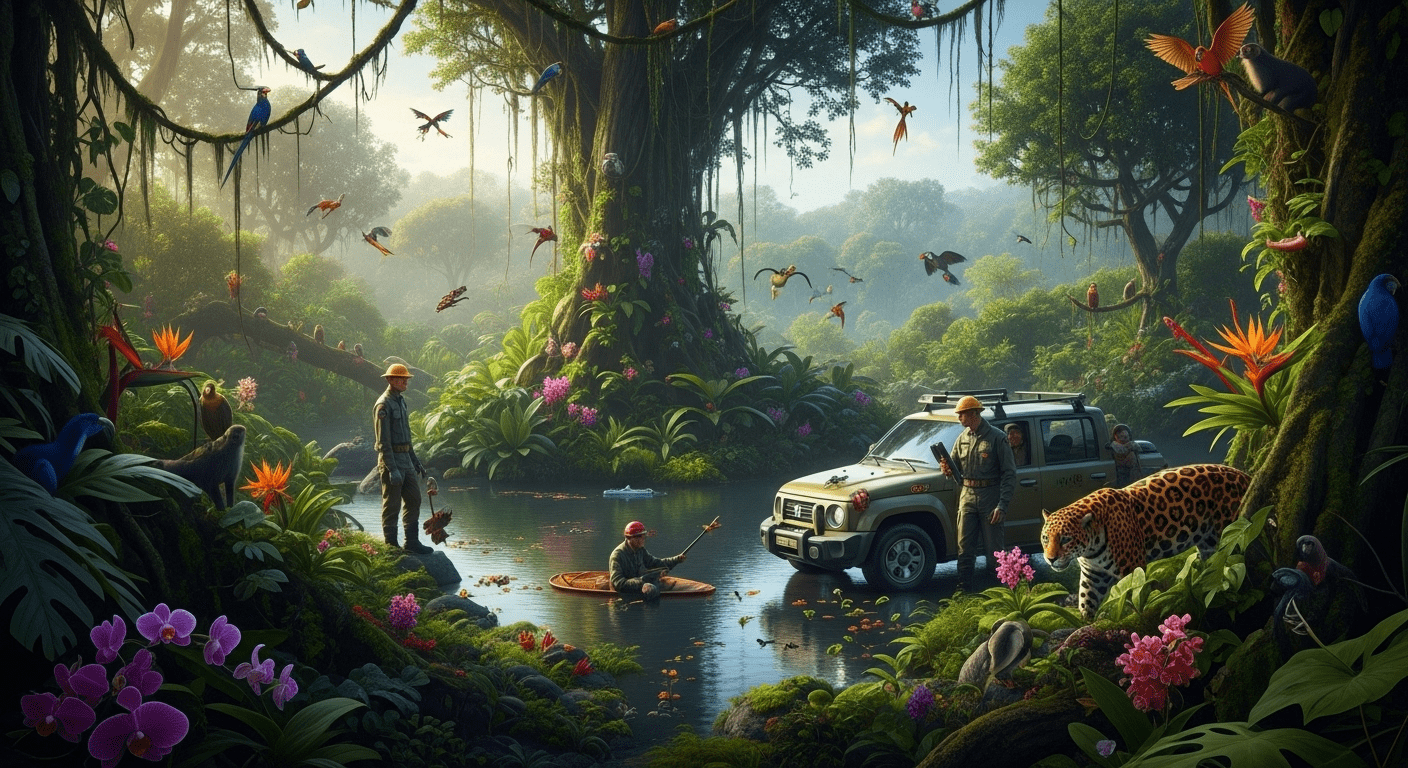 A lush, vibrant rainforest scene featuring conservation efforts, with diverse foliage, wildlife, and a subtle sense of urgency in the atmosphere. no texts on scene. Photorealistic style, high resolution, 4k details, HDR, cinematic lighting, professional photography, studio lighting, vibrant colors.